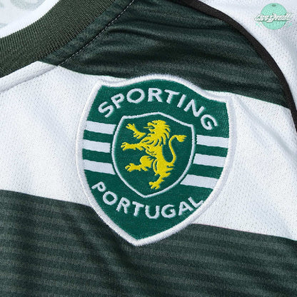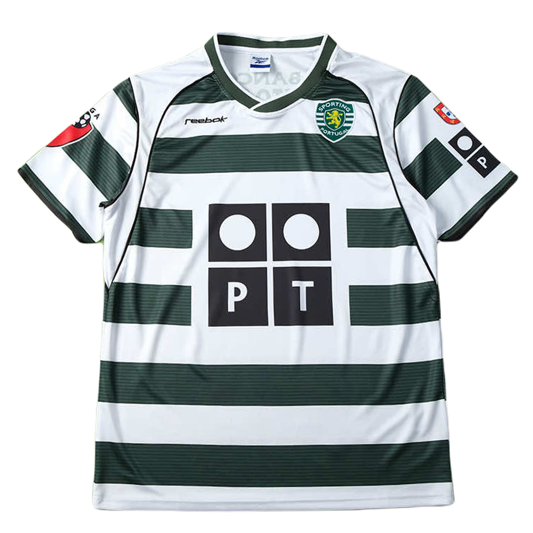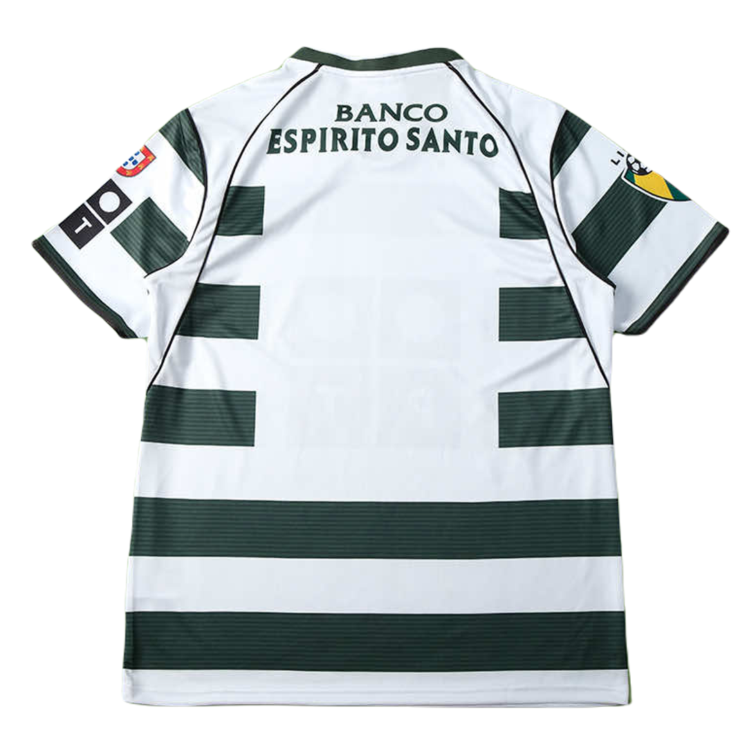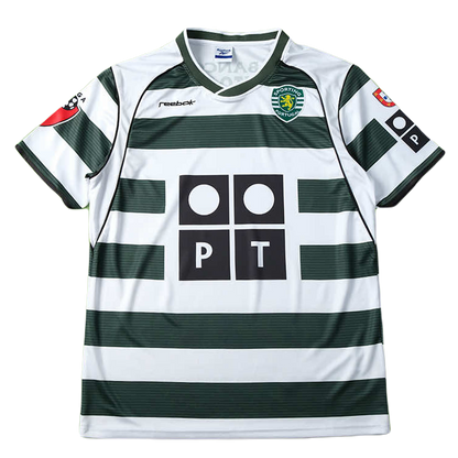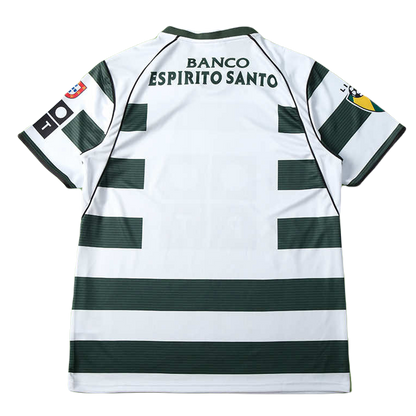 Get ready to support Sporting in style with their 2002/03 Vintage Home Jersey. The Sporting CP 2002-2003 home jersey is a classic representation of the club's traditional colors and design. This jersey features the iconic green and white horizontal stripes, a hallmark of Sporting Clube de Portugal's identity. The stripes are evenly spaced, creating a bold contrast that is visually striking. The collar is a simple black V-neck, adding a touch of elegance to the overall design.