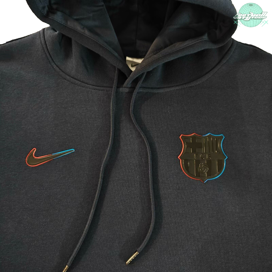 Get ready to support Barcelona in style. The Barcelona 2024 Fan Art sweaters combine modern design with a tribute to the club’s legacy and its passionate fanbase. The blue version, pictured here, offers a sleek and premium aesthetic. On the left side, a subtle, dark-toned Barcelona crest nods to the club's storied history, while the right side showcases the iconic logo.
