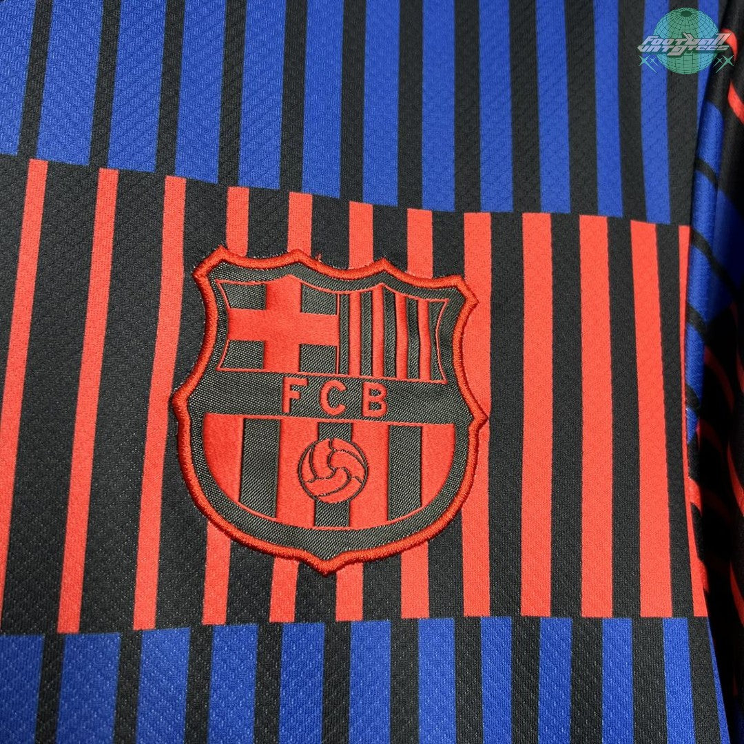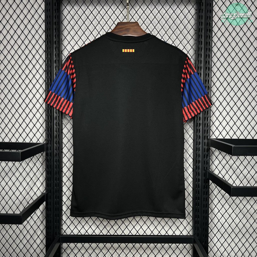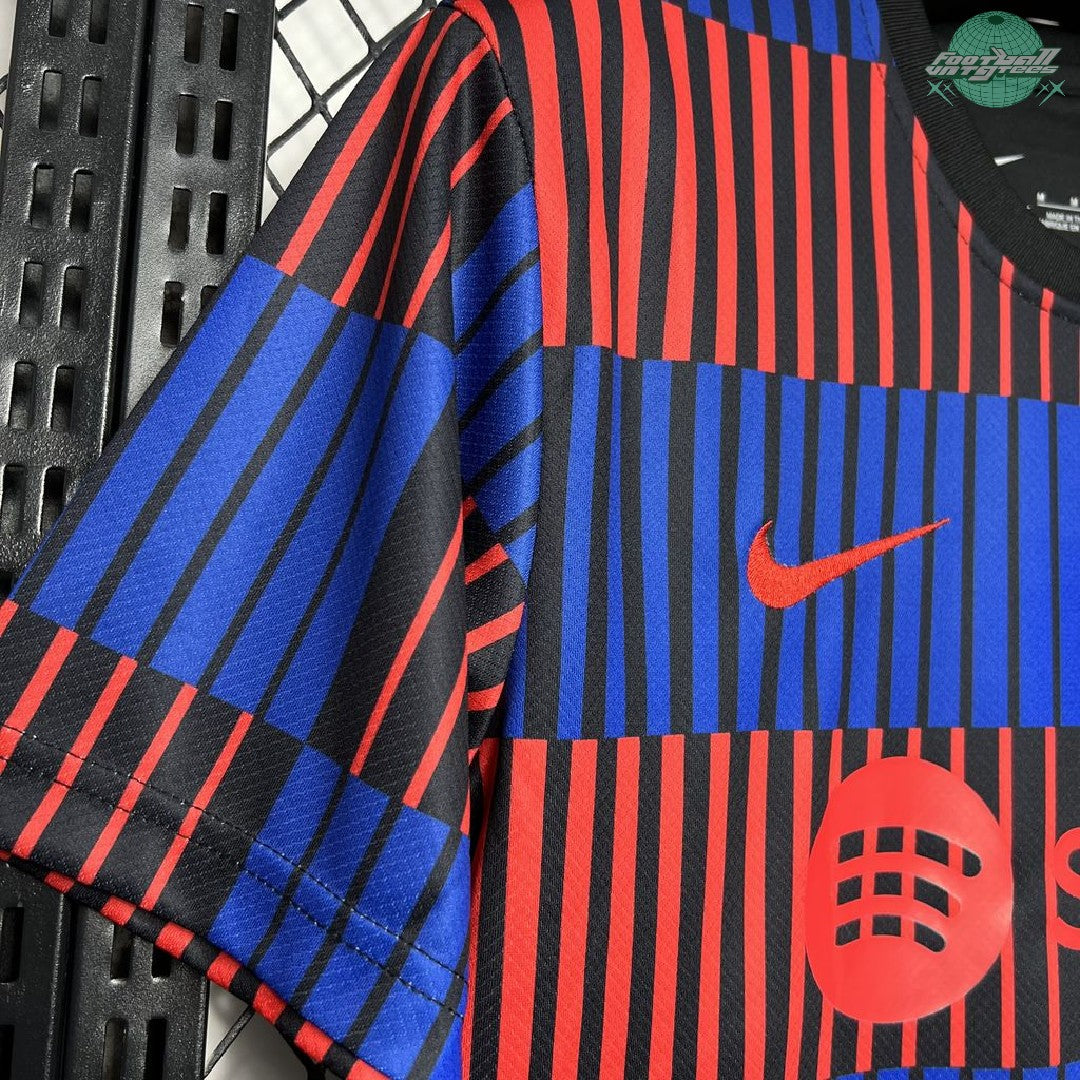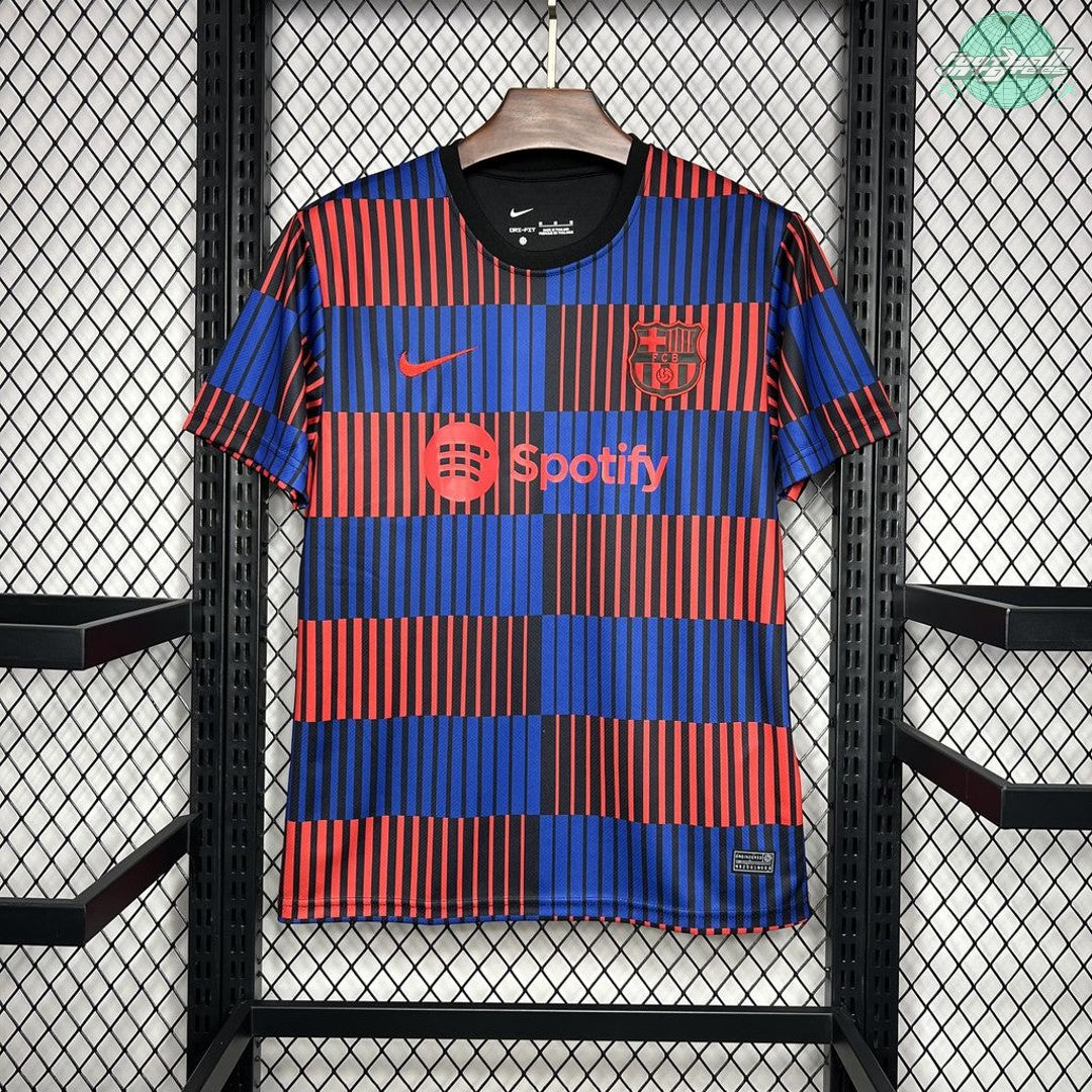 Get ready to support Barcelona in style with the 2024-2025 Special Pre Match Jersey! This mainly Black colorway Barcelona Kit has stripes of classic blue & red and it is made from high-quality materials & features a sleek and modern design with the iconic Barcelona crest in red colorway and the beautiful Spotify logo.