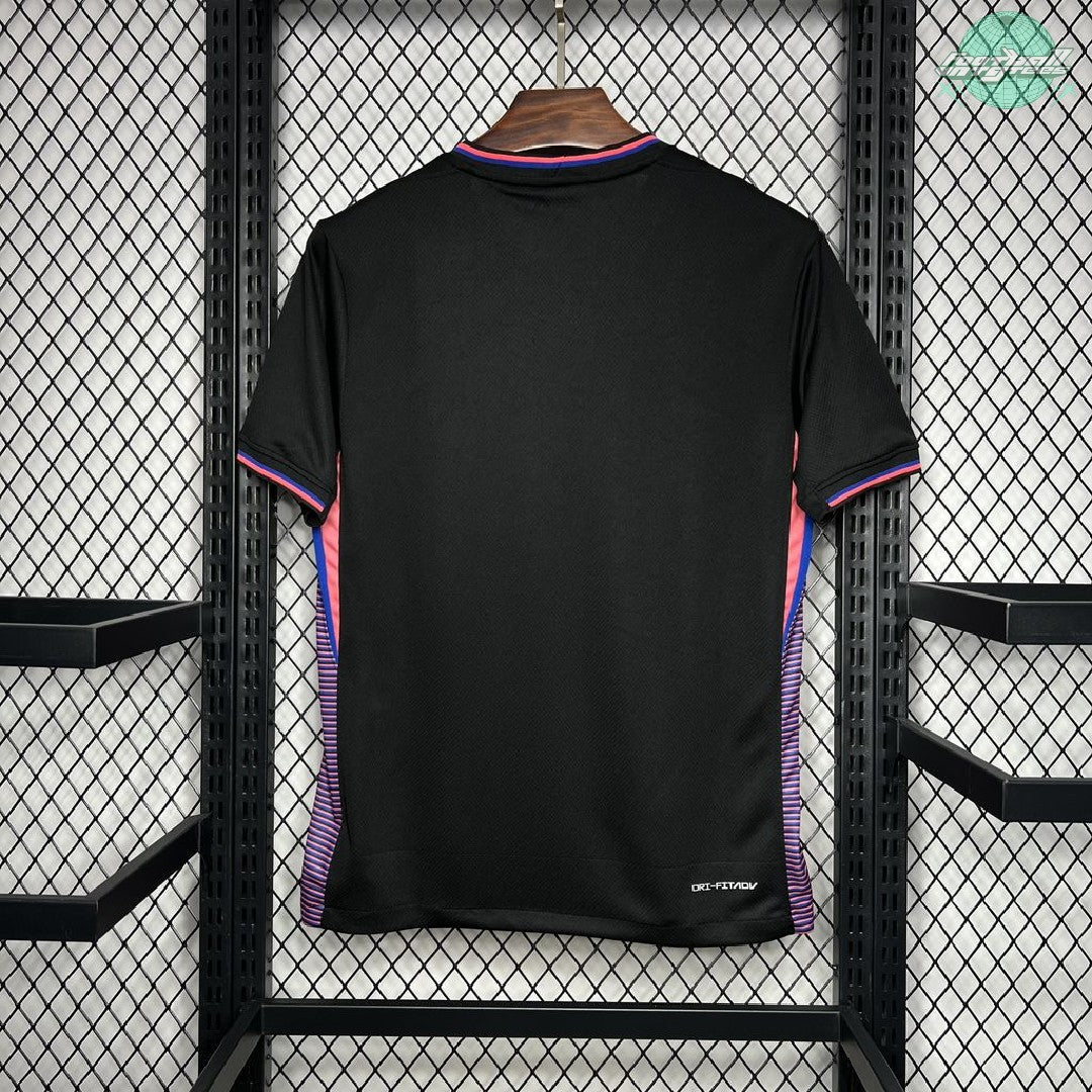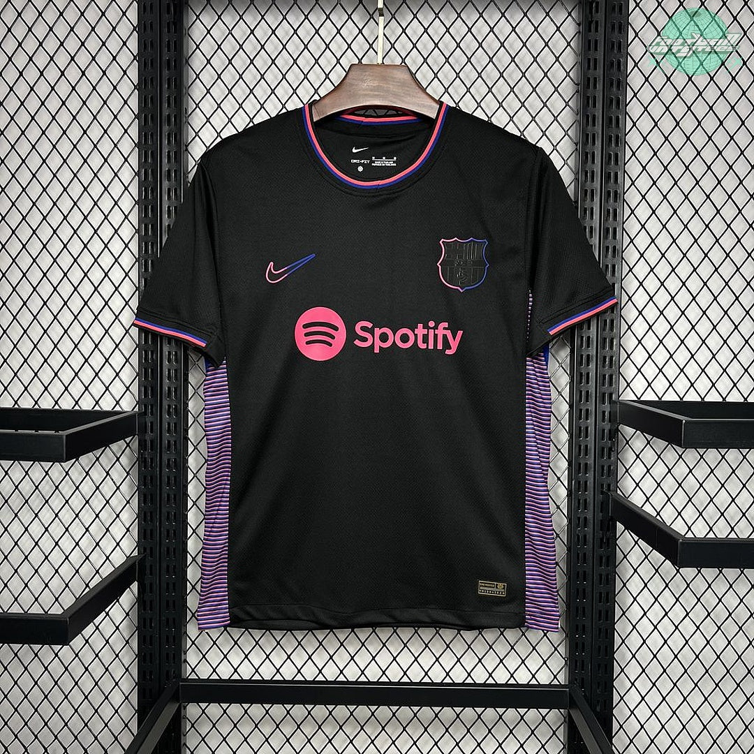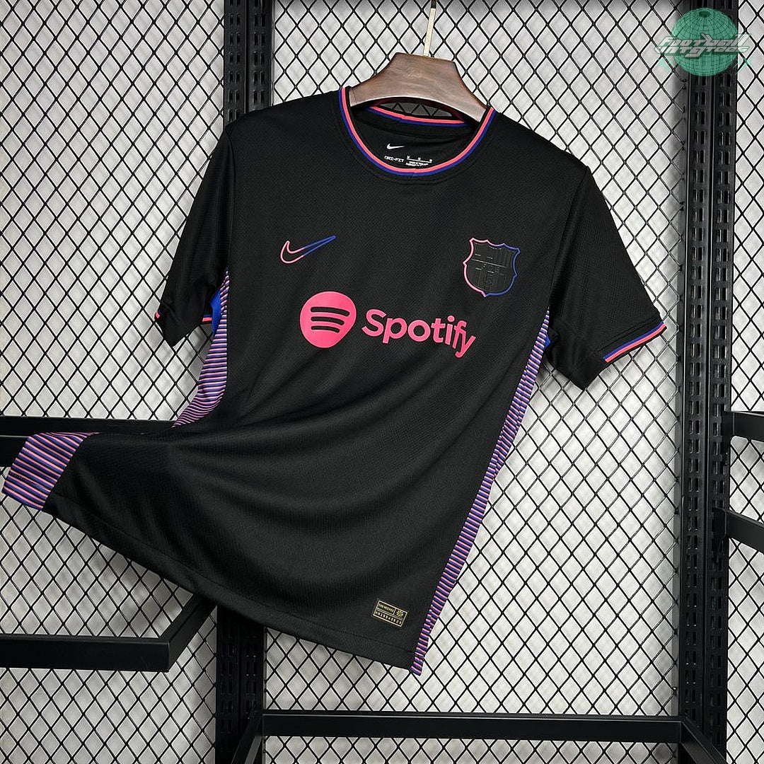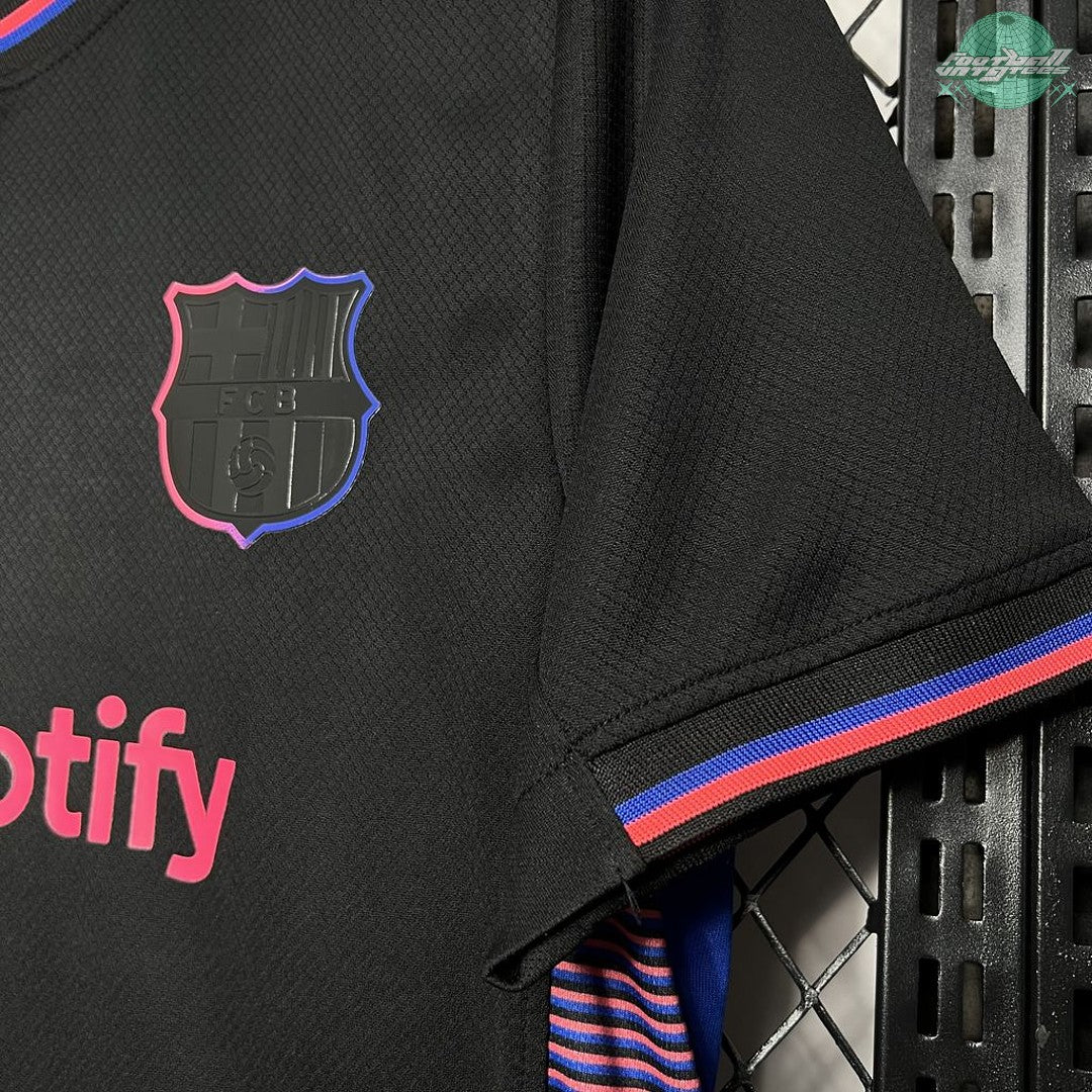 Get ready to support Barcelona in style with the 2024-2025 Special "Nights" Jersey! This mainly Black colorway Barcelona Kit has stripes of neon purple, pink and blue is made from high-quality materials & features a sleek and modern design with the iconic Barcelona crest in neon colorway and the beautiful Pink Spotify logo.