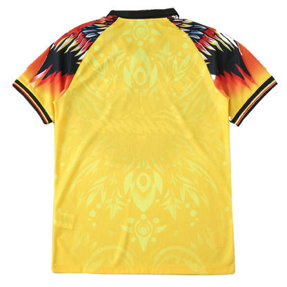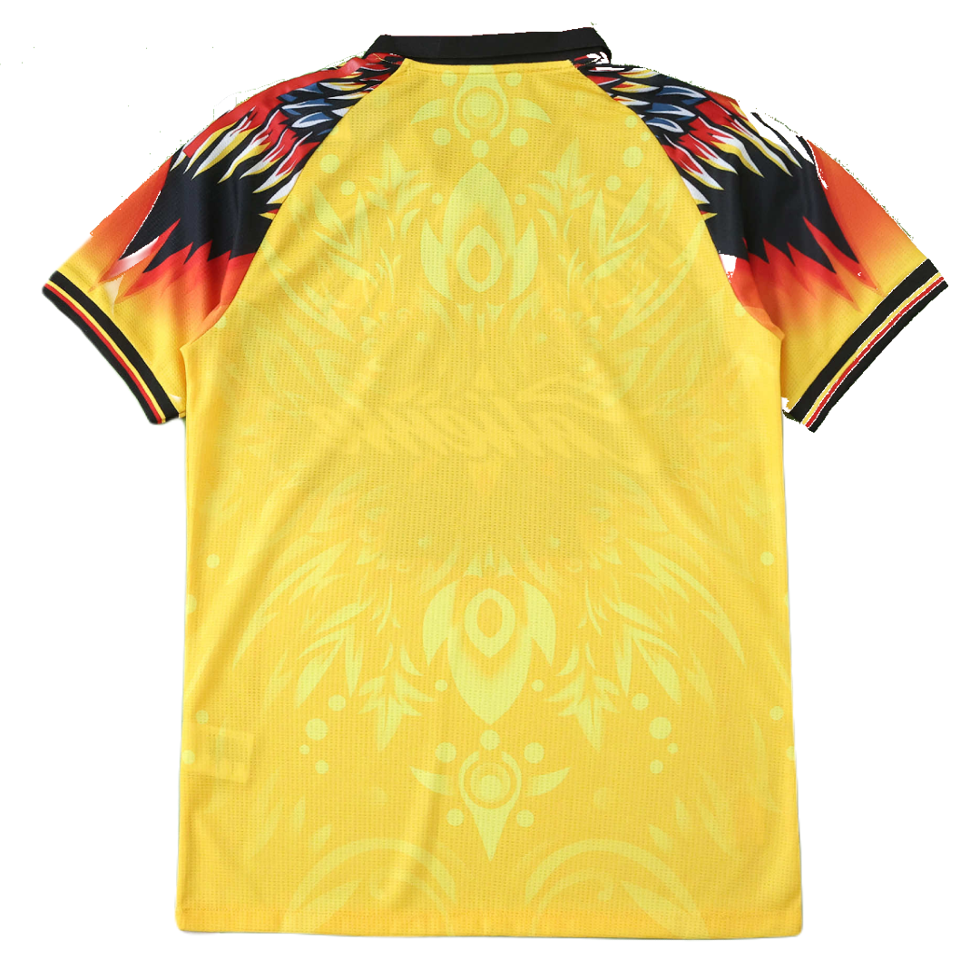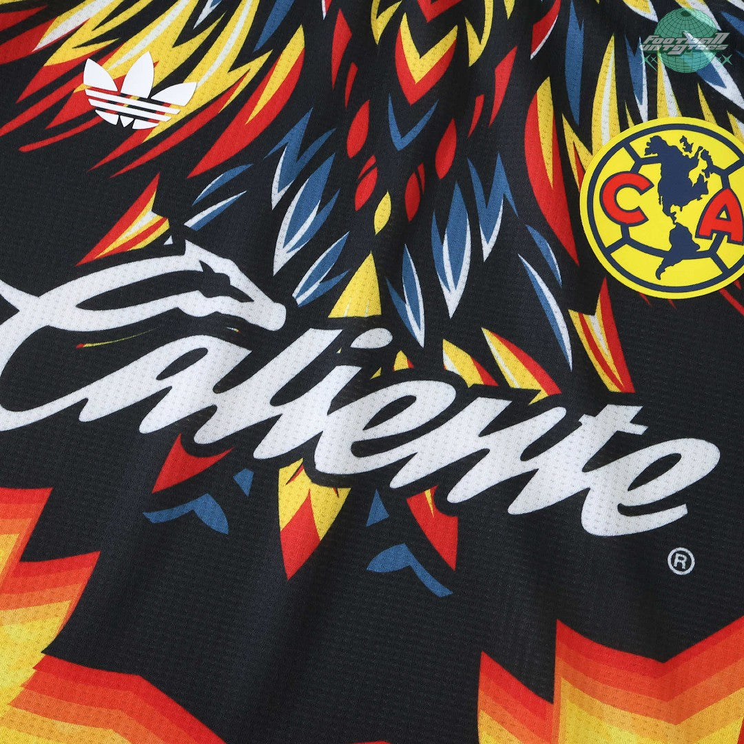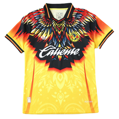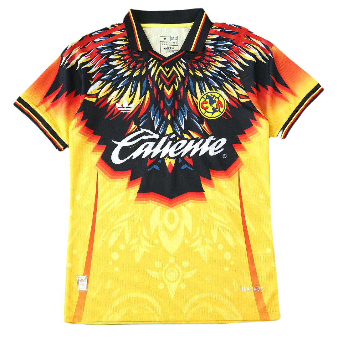 This electrifying jersey features a stunning feathered design inspired by the wings of an eagle — a nod to the club's iconic nickname, "Las Águilas." With a vibrant fusion of red, yellow, black, and blue, this kit reflects the fierce pride and energy of Club América. The crest stands proudly on the chest, complemented by retro adidas detailing and a bold “Caliente” sponsor across the front. Made with HEAT.RDY technology for maximum comfort, it's not just a jersey — it's a symbol of flight, fight, and football passion.