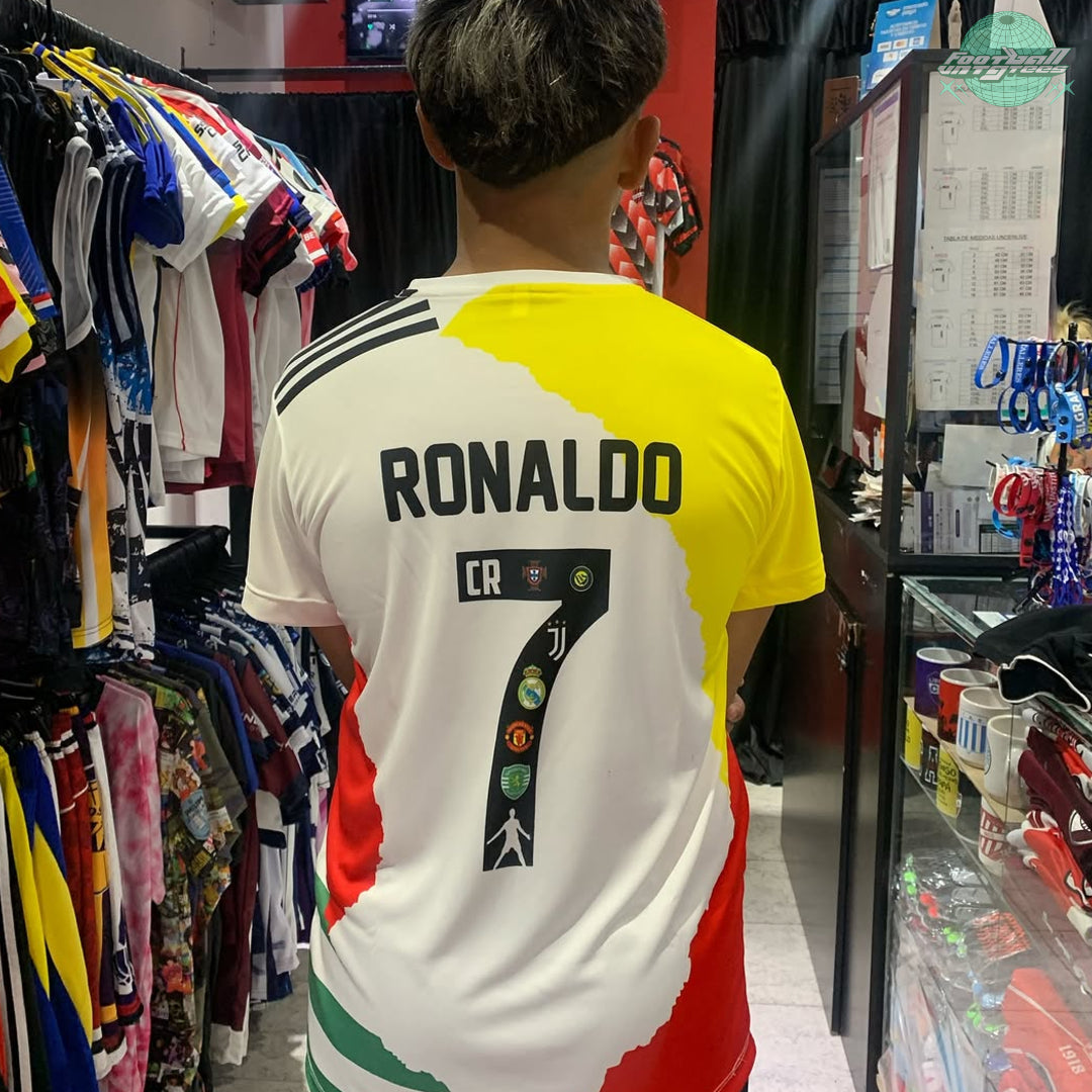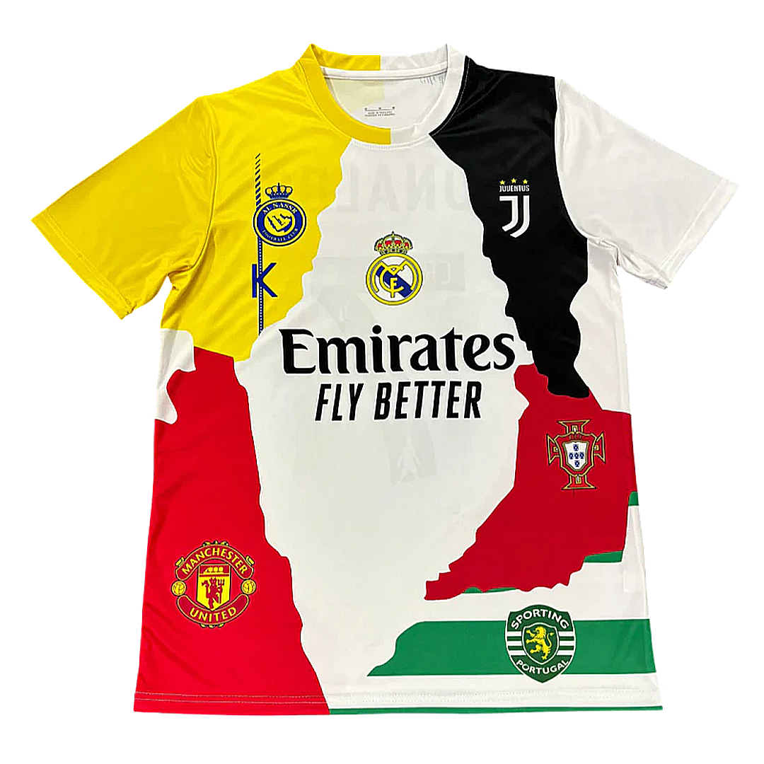 Cristiano Ronaldo "G.O.A.T" Jersey is an exclusive jersey made by FootballVintageTees. The jersey is made to honor Ronaldo for his career and all that he has accomplished. It features pieces from all his clubs: Sporting, Manchester United, Real Madrid, Juventus, and the Portugal national team. An iconic jersey for an iconic player