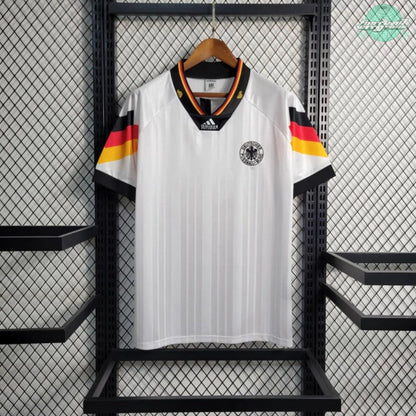Get ready to support Germany in style with their 1992 Home Jersey. The Germany 1992 vintage home soccer jersey is a standout piece from the early '90s, reflecting the bold and unique design style of that era. Featuring the iconic black, red, and gold color scheme of the German flag, the jersey showcases a sharp, diagonal pattern across the chest, with vibrant stripes that create a dynamic, energetic look.