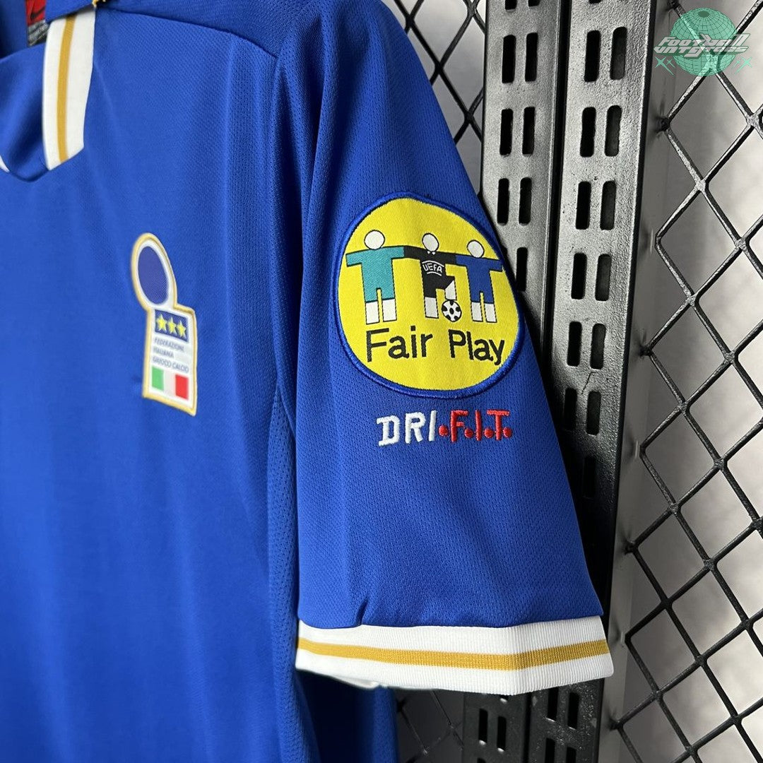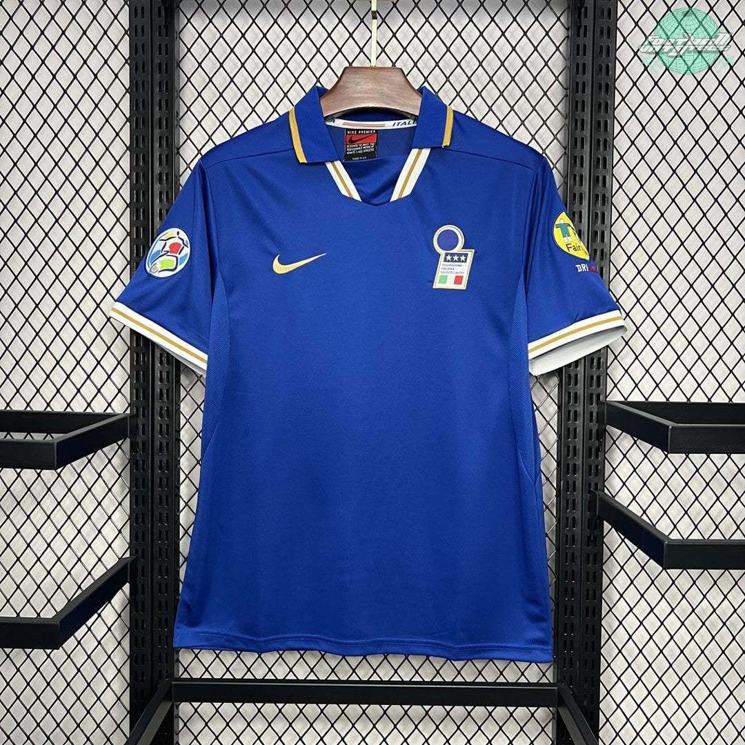 Get ready to support Italy in style with their 1996 Retro Jersey. This Kit is made from high-quality materials & features a sleek and classic design in blue with the iconic Italy crest and Italia symbol on the sleeves and the back.
