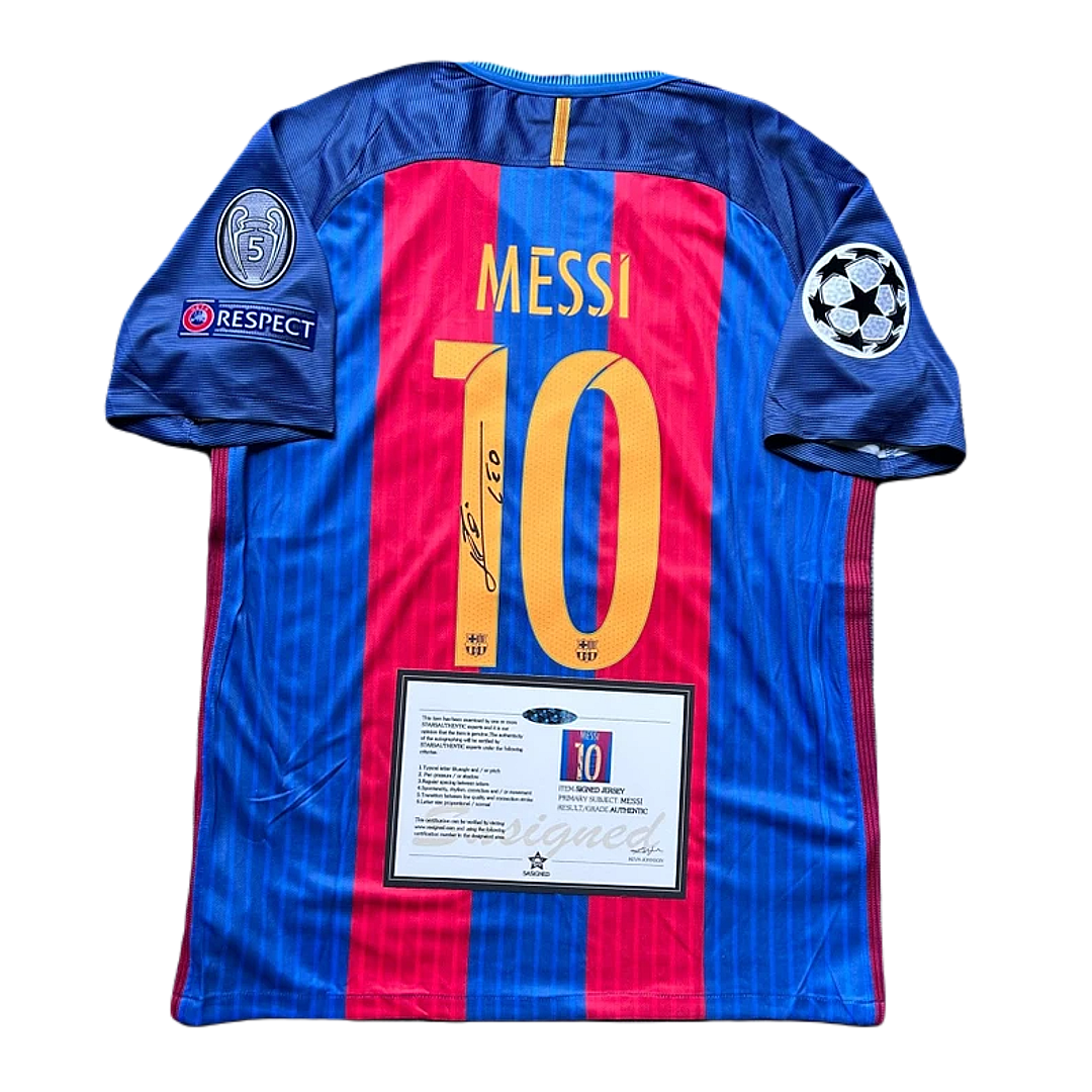 This 2016–17 signed "Messi #10" jersey is an iconic piece of art. Barcelona was involved in four competitions after winning the double of La Liga and the Copa Del Rey in the previous season. This would be the final season under head coach Luis Enrique as he decided to let his contract expire. The Argentine has scored 37 goals in 34 matches in the league, enough to win the Golden Shoe in Europe.