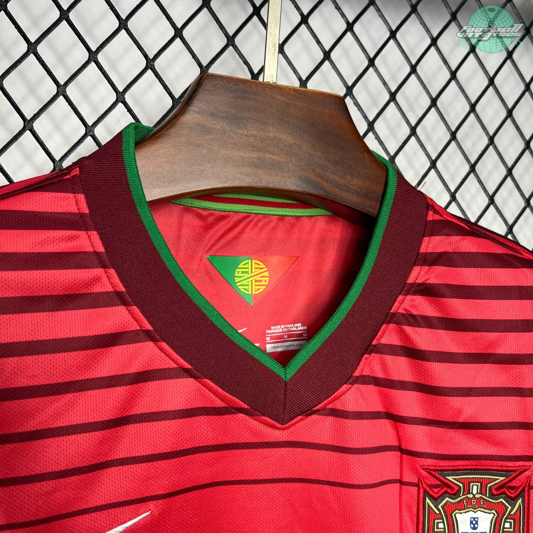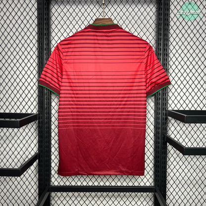 Embrace the passion and pride of Portuguese football with the Portugal 2014 Home Jersey, a striking symbol of the nation's journey in the FIFA World Cup in Brazil. This jersey, with its deep red design, reflects the intensity and determination of the Portuguese squad. The subtle horizontal stripes add a modern twist, while the green trim along the collar pays homage to the national colors. The Nike swoosh and the FPF (Federação Portuguesa de Futebol) crest sit proudly on the chest, representing the heart and soul of Portuguese football.