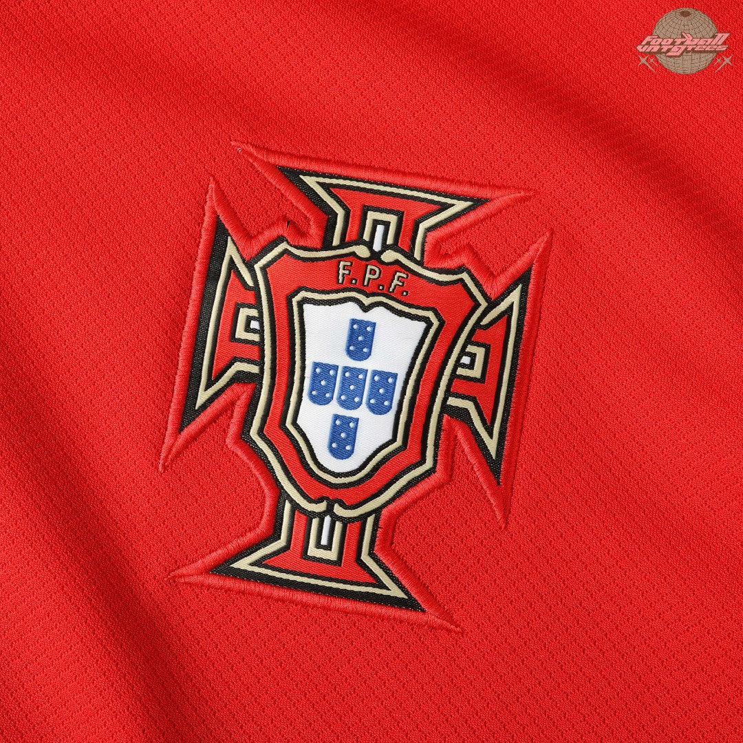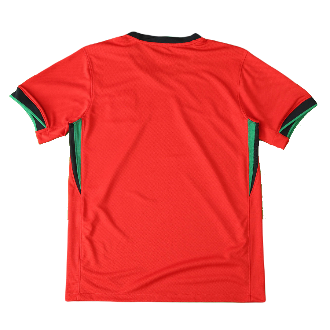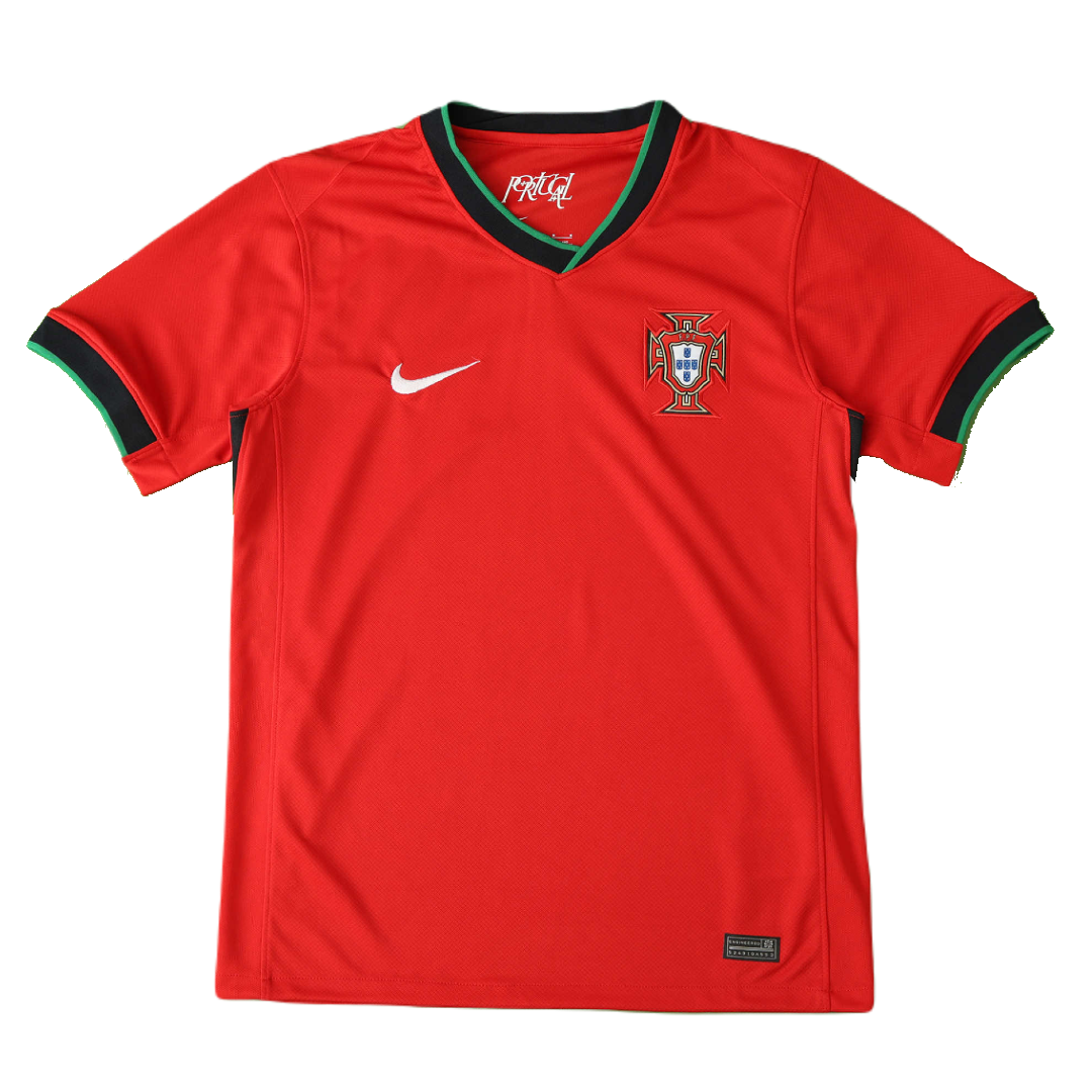 Get ready to support Portugal in style with their 2024 Euro Home Jersey. The Portugal 2024 Euro jersey features a vibrant red base with subtle green accents on the sleeves and sides, reflecting the national colors. The crest sits proudly on the left chest, paired with a gold Nike logo on the right. A crew-neck collar with green trim keeps the design sleek, while a small Portuguese flag on the back adds a patriotic touch. Made with lightweight, breathable Dri-FIT fabric, this jersey blends tradition and modern performance for the 2024 tournament.