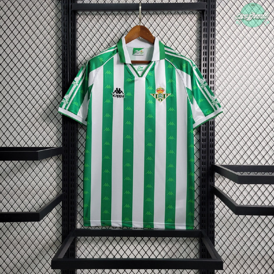 Get ready to support Real Betis in style with their 1996/97 Vintage Home Jersey. The Real Betis vintage home jersey is a classic piece of football nostalgia, representing an era of passion and elegance in Spanish football. The jersey features the club's traditional green and white vertical stripes, symbolizing the pride of Andalusia. These stripes are bold and wide, creating a striking visual contrast that is instantly recognizable.