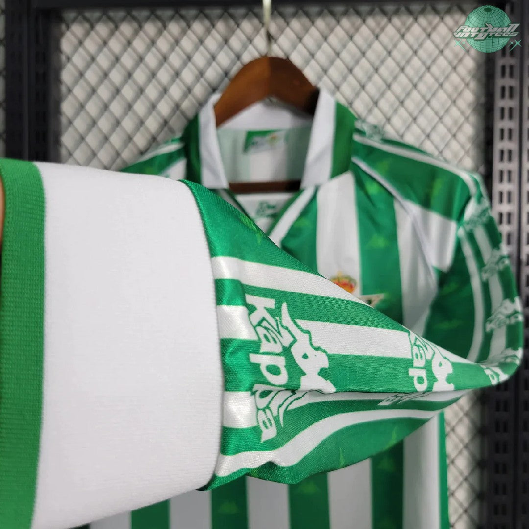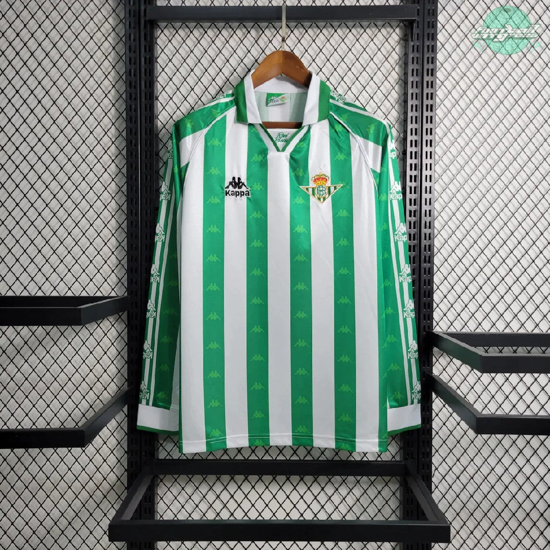Get ready to support Real Betis in style with their 1996/97 Vintage Long Sleeve Jersey. The Real Betis vintage home jersey is a classic piece of football nostalgia, representing an era of passion and elegance in Spanish football. The jersey features the club's traditional green and white vertical stripes, symbolizing the pride of Andalusia. These stripes are bold and wide, creating a striking visual contrast that is instantly recognizable.
