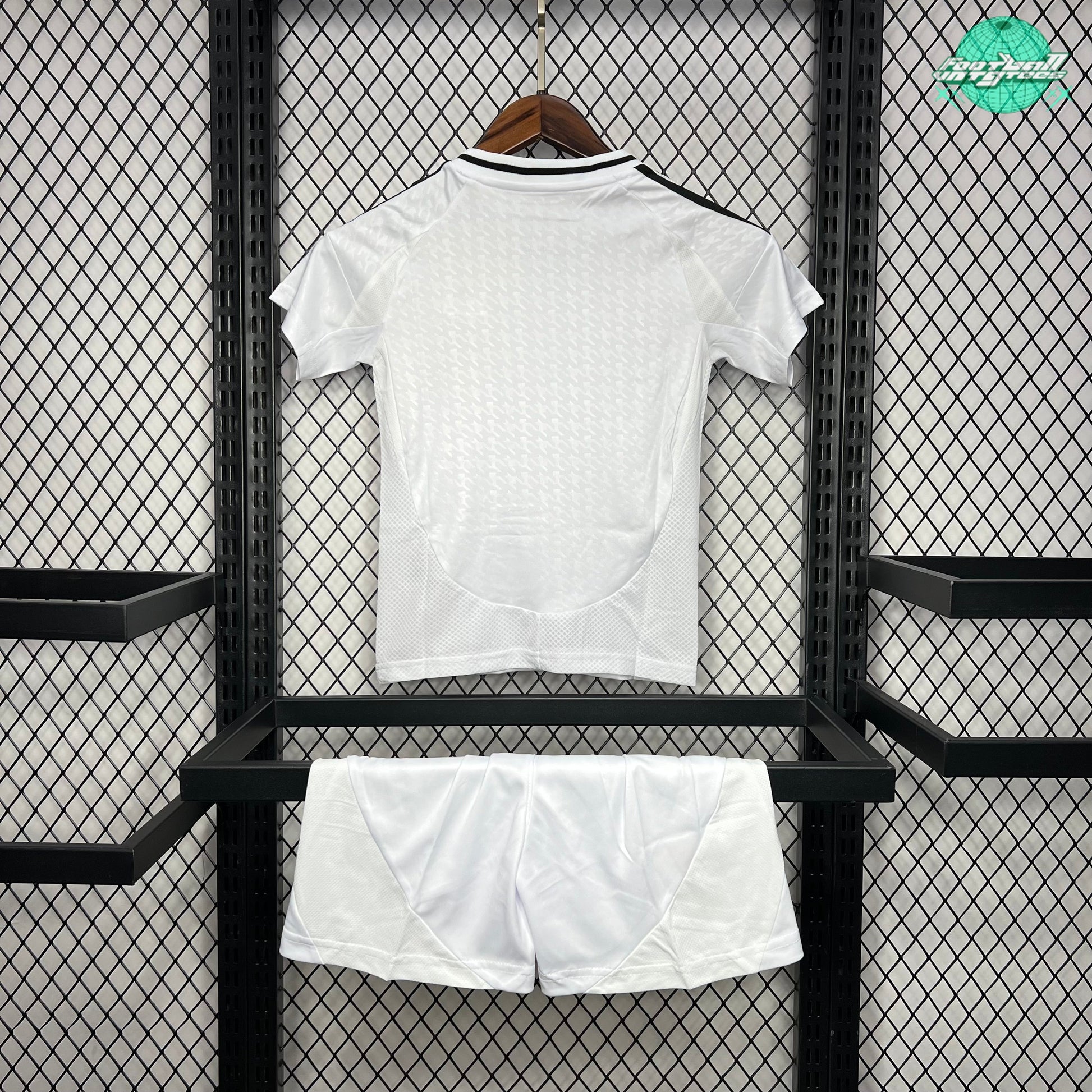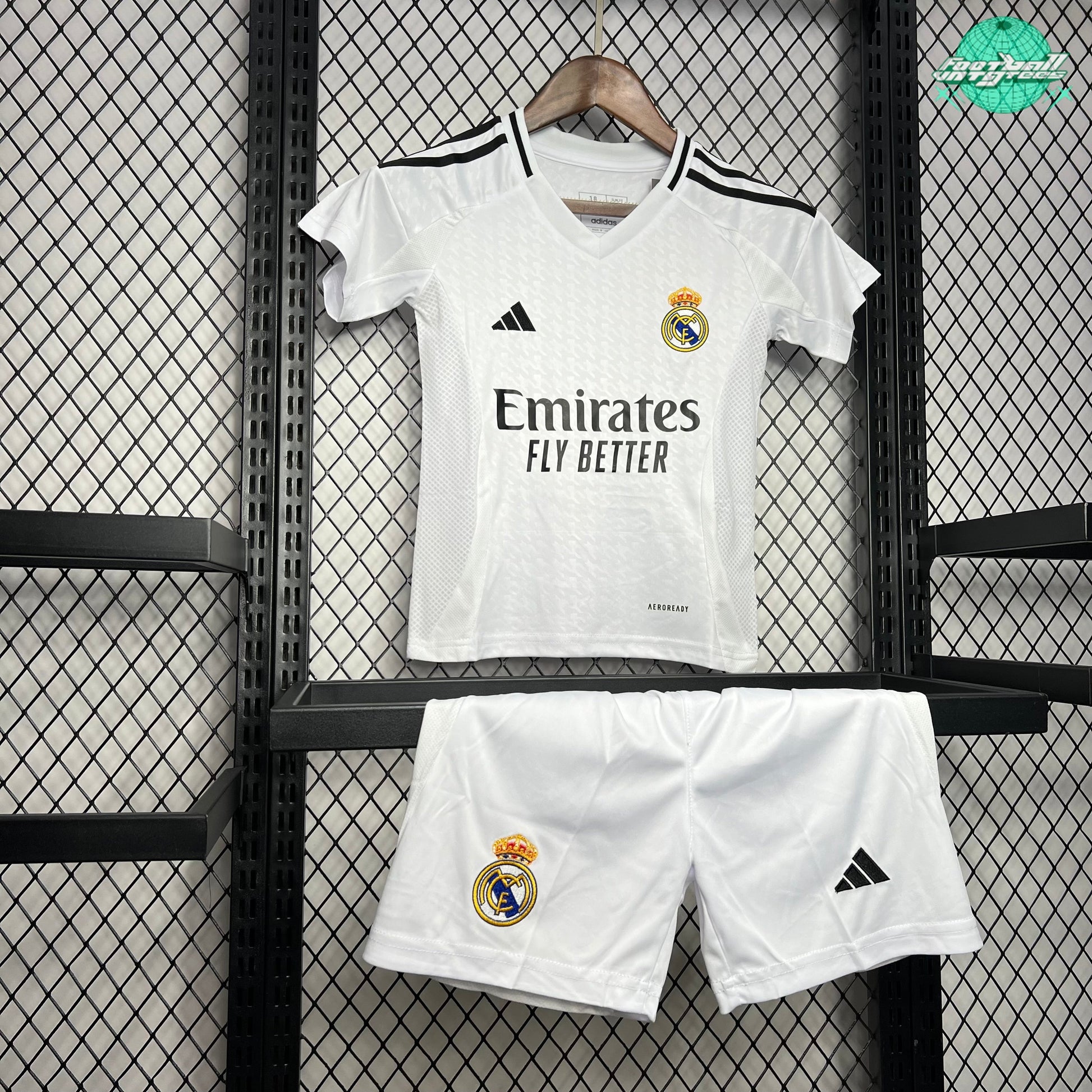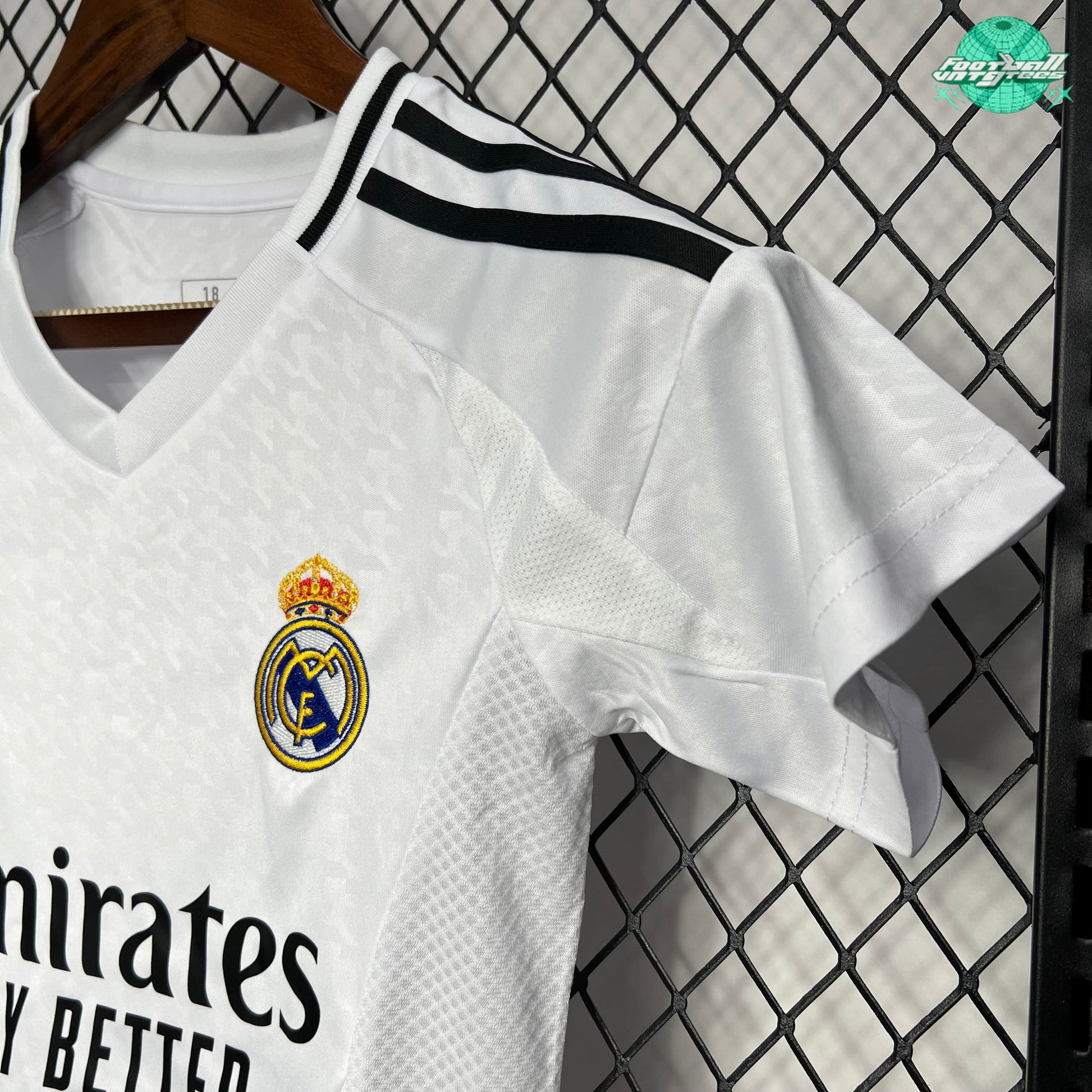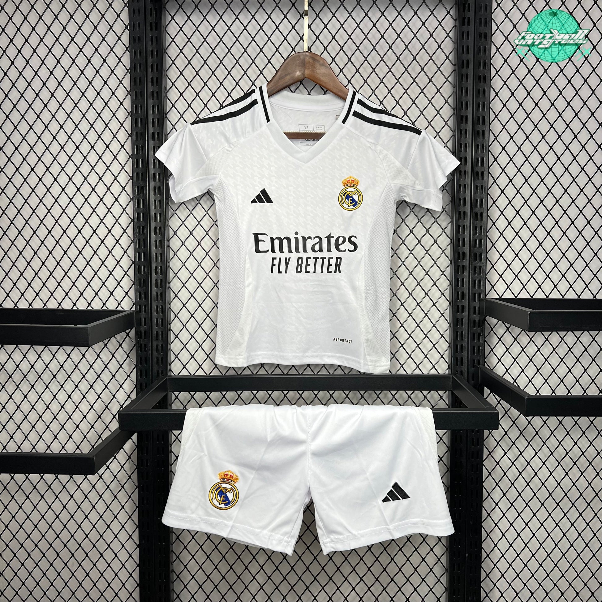The new Real Madrid home kids kit introduces a clean look in white with black trim, and will be worn in La Liga and the Champions League next season. This Real Madrid 2024-2025 home kit evokes memories of the early 2000s kits, thanks to its classic color combo and simple design.