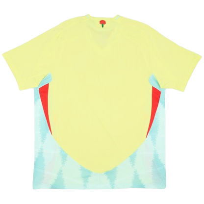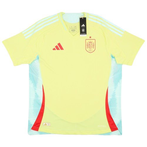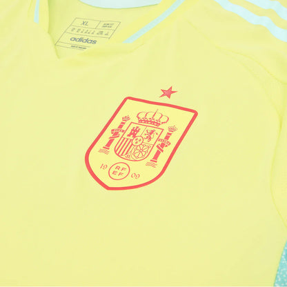 It is mainly Pale Neon Yellow, possibly inspired by the sand dunes of the country. Officially, the color name of the Spain 2024 away football shirt is "Pulse Yellow."Adidas combines the Spain Euro 2024 away kit with red logos and light blue Three Stripes and detailing