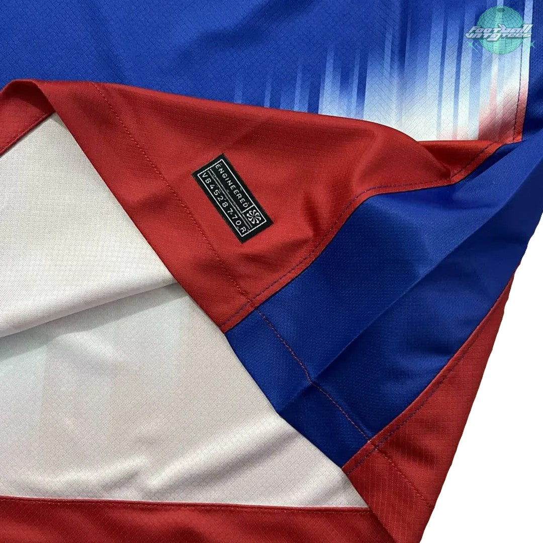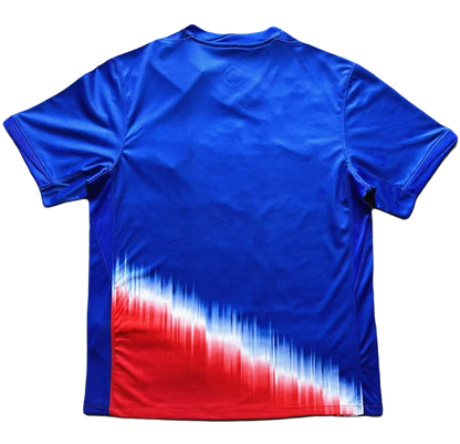 Get ready to support USA in style with their 2024 Copa América Away Jersey. The US Soccer 2024 away jersey has a well-known color combo but a bold new design. Blue and red are combined with white for logos and applications. Officially, the colors are "Old Royal/Sport Red/White/White".