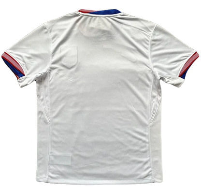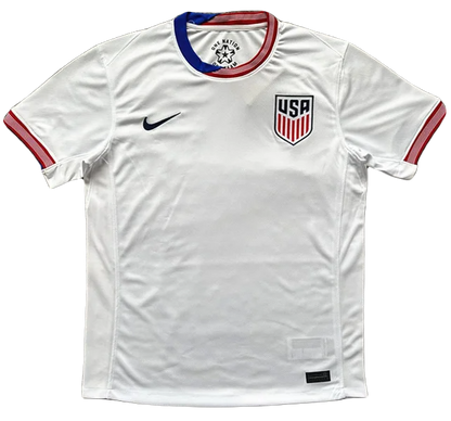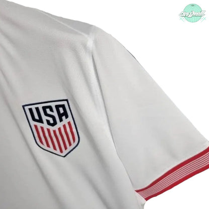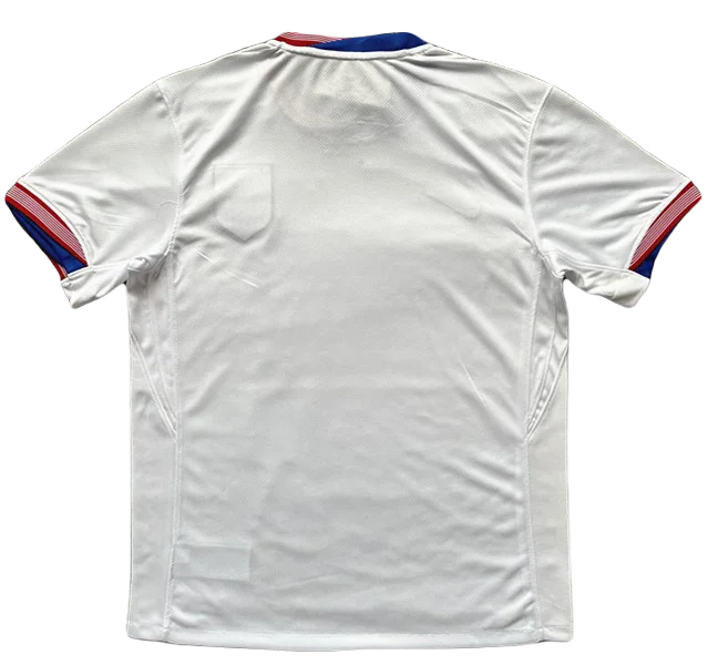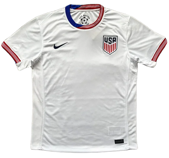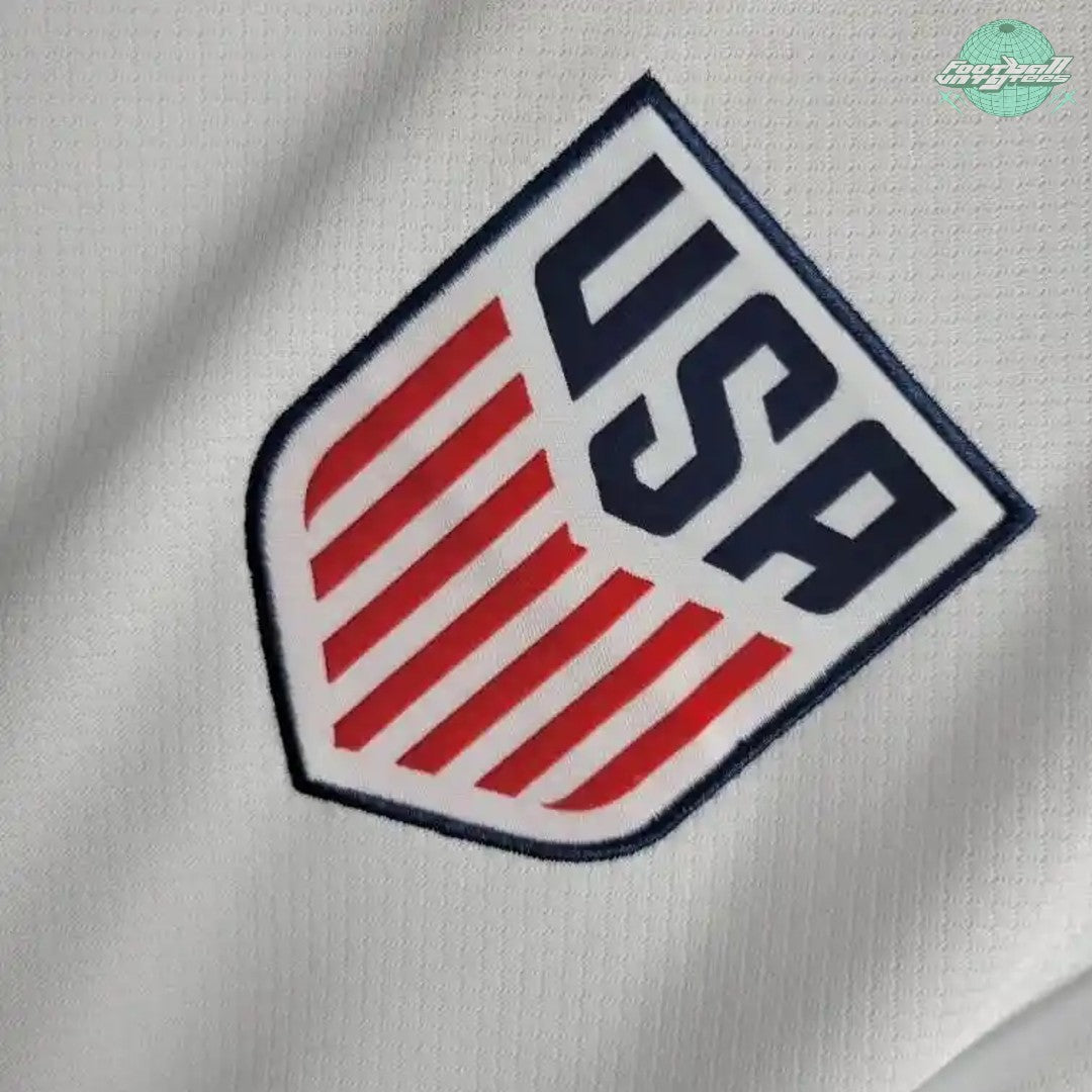 Get ready to support USA in style with their 2024 Copa América Home Jersey. The USA 2024 football shirt has a classic yet unique design. It combines a white base with navy and red. What let the USA 2024 home kit stand out is the collar and sleeve cuffs. The collar comes with a half-and-half design showcasing the US flag, a theme continued on the sleeve cuffs.